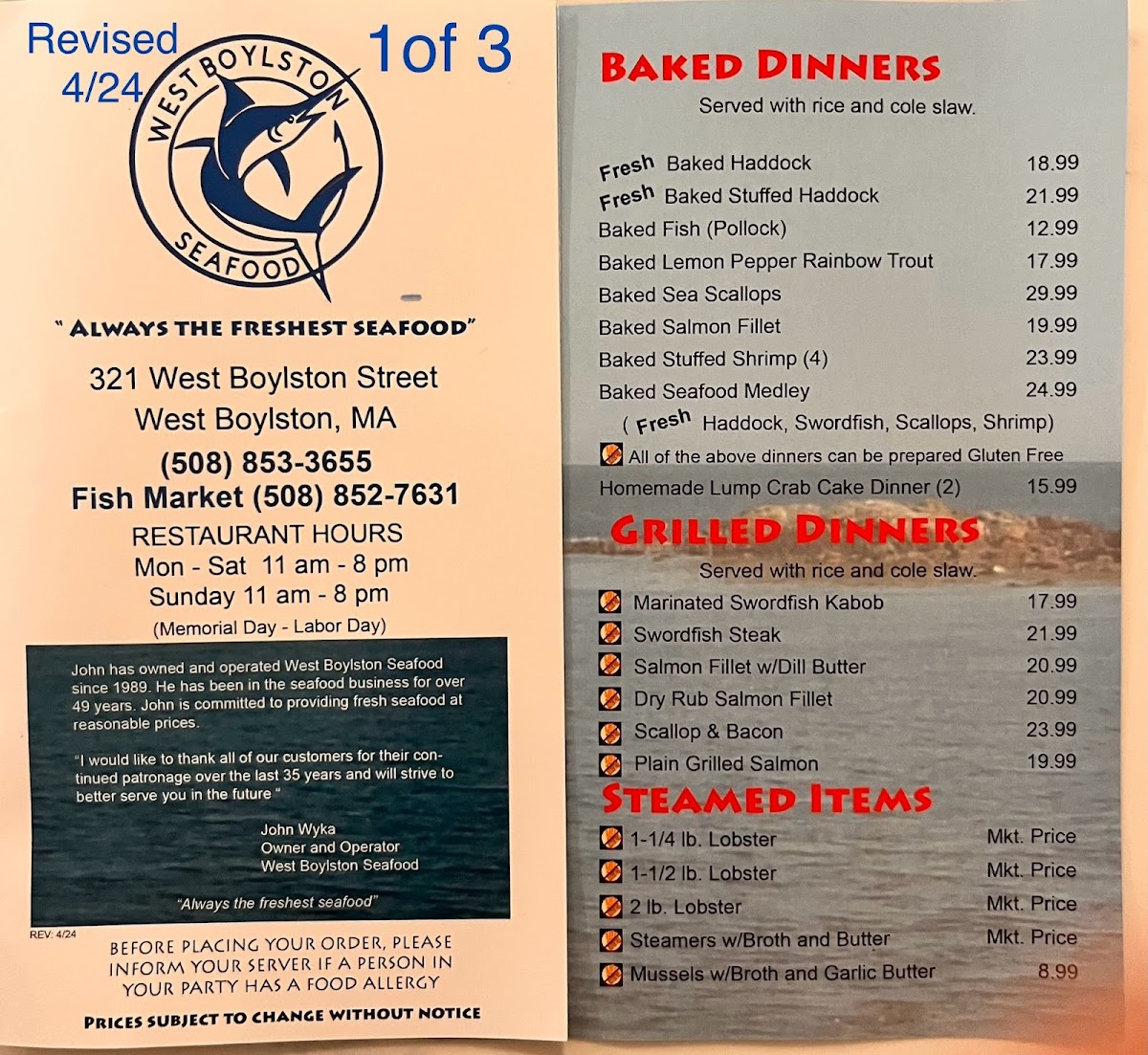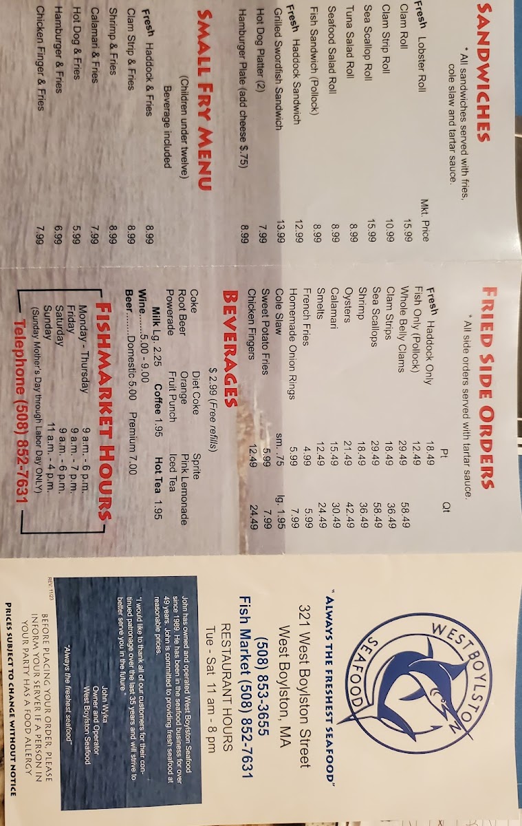 West Boylston Seafood & Restaurant Menu